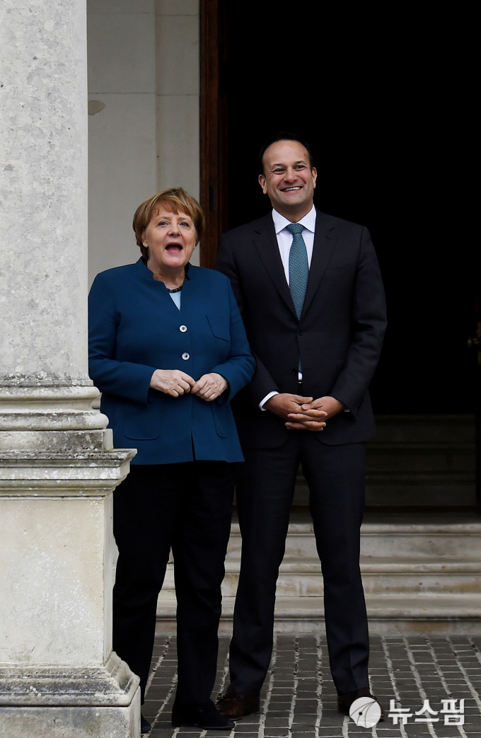 | [더블린 로이터=뉴스핌] 백지현 수습기자 = 4일(현지시간) 아일랜드 더블린에서 레오 바라드카르 아일랜드 총리가 앙겔라 메르켈 독일 총리를 맞이하고 있다. 2019.04.05 |