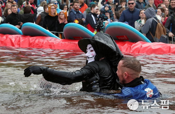| [로고이스크 로이터=뉴스핌] 박우진 수습기자 = 7일(현지시간) 벨라루스 로고이스크 마을에서 열린 만화 축제인 '캘리포니케이션 9.0'에서 벤데타 가면을 쓴 스노보더가 겨울이 끝난 것을 기념해 얼음물에 빠지고 있다. 2019.04.07 |