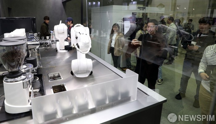 [서울=뉴스핌] 정일구 기자 = 11일 오후 서울 강남구 코엑스에서 열린 '2019 서울커피엑스포'에서 관람객들이 로봇 커피머신을 살펴보고 있다. 다양한 커피 관련 상품들을 만나볼 수 있는 '서울커피엑스포'는 오는 14일까지 코엑스 A홀과 B홀에서 열린다. 2019.04.11 mironj19@newspim.com