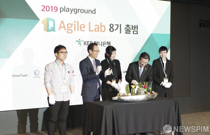 [서울=뉴스핌] 백인혁 인턴기자 = 김용범 금융위원회 부위원장과 지성규 KEB 하나은행장이 18일 오전 서울 중구 KEB하나은행 본점에서 열린 '1Q 애자일 랩(Agile Lab) 8기 출범식에서 참석해 8기 대표들과 세레머니를 하고 있다. 2019.04.18 dlsgur9757@newspim.com
