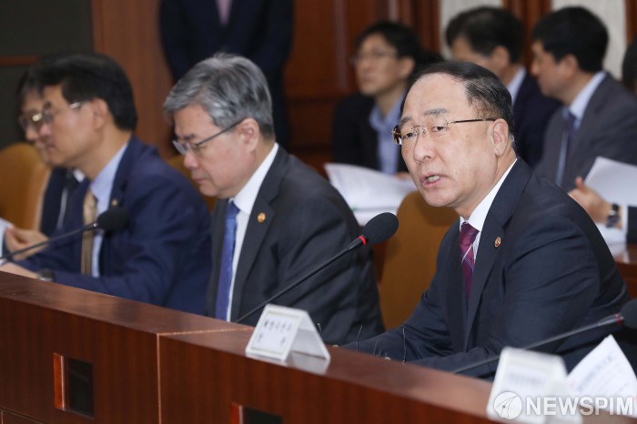 [서울=뉴스핌] 윤창빈 기자 = 홍남기 부총리 겸 기획재정부 장관이 23일 오전 서울 종로구 정부서울청사에서 열린 산업경쟁력강화 관계장관회의에서 모두발언을 하고 있다. 2019.04.23 pangbin@newspim.com