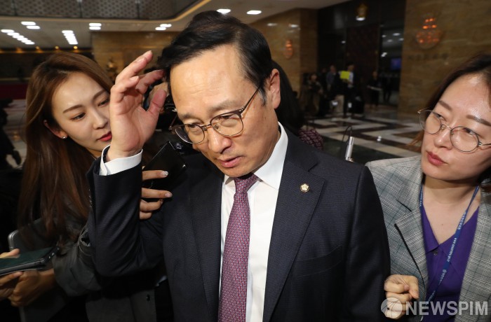 [서울=뉴스핌] 김학선 기자 = 홍영표 더불어민주당 원내대표가 29일 오후 국회에서 열린 비공개 의원총회를 마치고 국회 본청을 나서고 있다. 민주당은 이날 의총에서 바른미래당이 고위공직자범죄수사처(공수처)법을 별도 발의, 패스트트랙(신속처리법안)에 기존 법안과 함께 올리자고 제안한 내용을 수용하기로 결정했다. 2019.04.29 yooksa@newspim.com