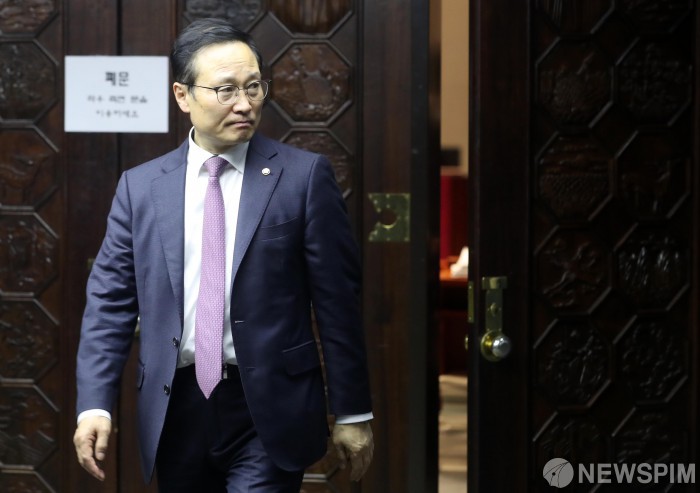 [서울=뉴스핌] 김학선 기자 = 홍영표 더불어민주당 원내대표가 29일 오후 국회에서 열린 비공개 의원총회를 마치고 국회 본청을 나서고 있다. 민주당은 이날 의총에서 바른미래당이 고위공직자범죄수사처(공수처)법을 별도 발의, 패스트트랙(신속처리법안)에 기존 법안과 함께 올리자고 제안한 내용을 수용하기로 결정했다. 2019.04.29 yooksa@newspim.com