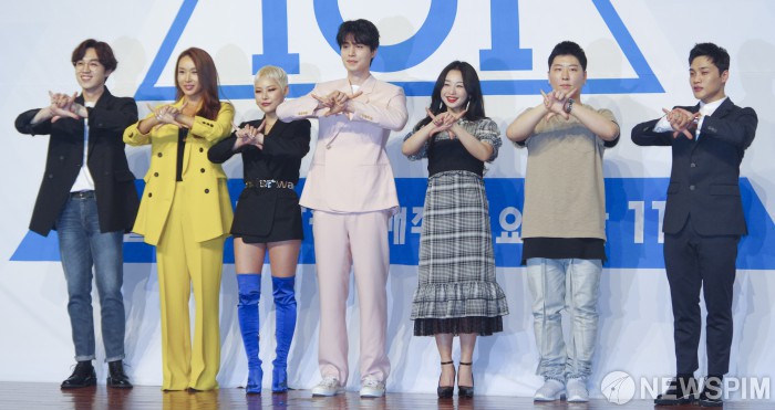 [서울=뉴스핌] 백인혁 인턴기자 = 이석훈(왼쪽부터),배윤정,치타,이동욱,신유미,권재승,최영준이 30일 오후 서울 영등포구 63 컨벤션센터 그랜드볼룸에서 열린 Mnet <프로듀스 X 101> 제작발표회에서 취재진을 향해 포즈를 취하고 있다. 2019.04.30 dlsgur9757@newspim.com