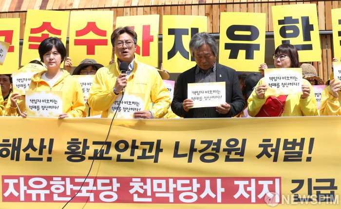 [서울=뉴스핌] 윤창빈 기자 = 1일 오후 서울 종로구 광화문광장에서 열린 ‘자유한국당 해산! 황교안과 나경원 처벌! 기억공간 앞 자유한국당 천막당사 저지 긴급 기자회견’에서 한 참가자가 발언하고 있다. 2019.05.01 pangbin@newspim.com