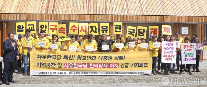 [서울=뉴스핌] 윤창빈 기자 = 1일 오후 서울 종로구 광화문광장에서 ‘자유한국당 해산! 황교안과 나경원 처벌! 기억공간 앞 자유한국당 천막당사 저지 긴급 기자회견’이 열리고 있다. 2019.05.01 pangbin@newspim.com