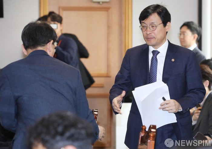 [서울=뉴스핌] 윤창빈 기자 = 이호승 기획재정부 제1차관(오른쪽)이 13일 오전 서울 중구 은행회관에서 열린 확대 거시경제금융회의에서 참석자와 인사를 나누고 있다. 2019.05.13 pangbin@newspim.com