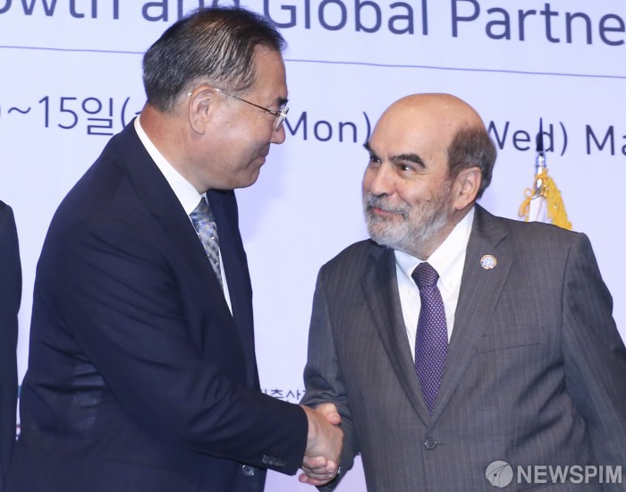 [서울=뉴스핌] 이한결 인턴기자 = 이개호 농림축산식품부 장관이 13일 오전 서울 중구 더 플라자 호텔에서 열린 제3회 지속가능농업개발을 위한 글로벌 ODA 포럼에 참석해 국제기구 관계자와 인사하고 있다. 2019.05.13 alwaysame@newspim.com