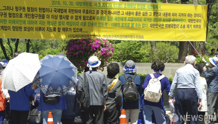 [서울=뉴스핌] 백인혁 인턴기자 = 21일 오전 서울 종로구 청와대 사랑채 옆 도로에서 대일청구권자금피해자환수위원회 회원들이 '대일청구권 자금환수 집회'를 하고 있다. 2019.05.21 dlsgur9757@newspim.com