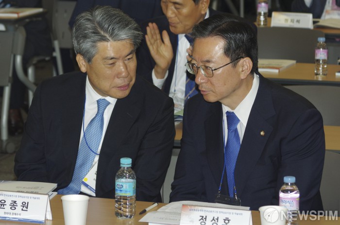 [서울=뉴스핌] 백인혁 인턴기자 = 윤종원 청와대 경제수석(왼쪽)과 정성호 더불어민주당 의원 겸 국회 기획재정위원회 위원장이 24일 오전 서울 중구 은행회관에서 열린 글로벌 금융학회 정책 심포지엄에 참석해 대화를 나누고 있다. 2019.05.24 dlsgur9757@newspim.com