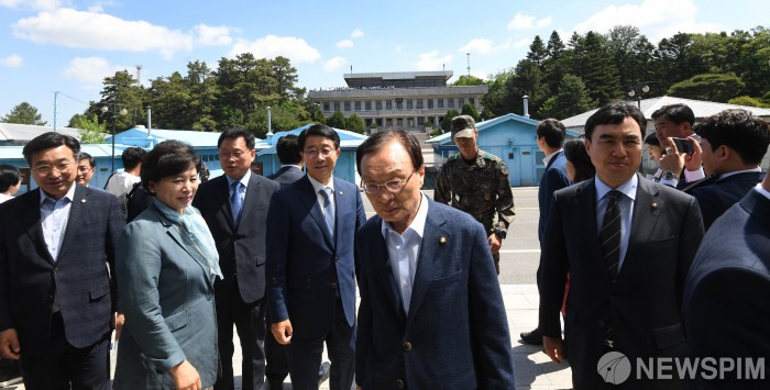 [파주=뉴스핌] 국회사진취재단 = 이해찬 더불어민주당 대표 등 당 지도부가 4·27 남북공동선언 1주년을 맞아 31일 오전 경기도 파주시 판문점 남측지역 자유의집에서 현장 최고위원회의를 마친 뒤 북측을 향해 손을 흔들고 뒤돌아서고 있다. 2019.05.31