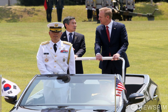 [서울=뉴스핌] 정일구 기자 = 정경두 국방부 장관과 패트릭 섀너핸 미국 국방장관 대행이 3일 오전 서울 용산구 국방부 연병장에서 의장대 사열을 받으며 이야기를 나누고 있다. 2019.06.03 mironj19@newspim.com