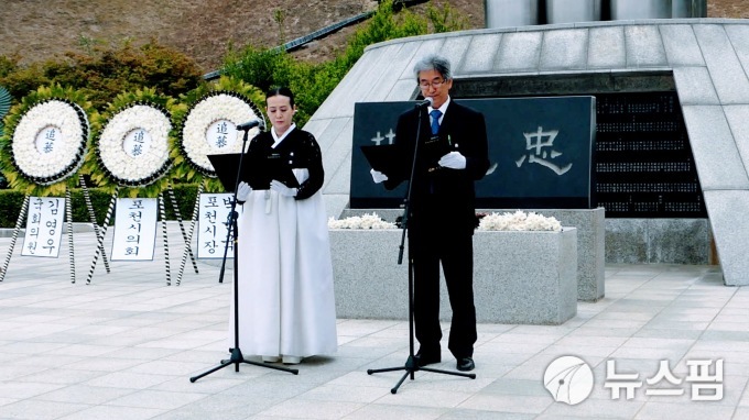 [포천=뉴스핌] 양상현 기자 = 6일 오전 10시 경기 포천시 군내면 청성역사공원 충혼탑에서 호국영령 및 순국선열들의 숭고한 뜻을 기리고 나라사랑 정신을 계승하기 위한 제64회 현충일 추념식이 개최된 가운데 손진홍 전 포천초등학교 교장과 이천희 시인 등 포천시 문인협회 소속 시인들이 '하나된 나라'라는 헌시를 낭독하고 있다.2019.06.05 yangsanghyun@newspim.com