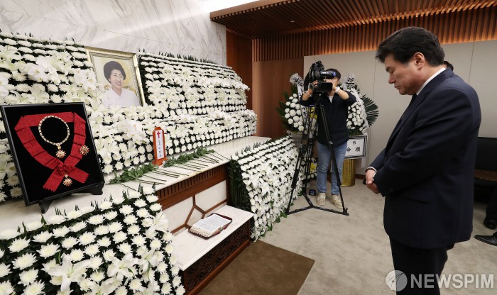 [서울=뉴스핌] 정일구 기자 = 원유철 자유한국당 의원이 12일 오전 서울 서대문구 신촌세브란스병원 장례식장에 마련된 김대중 전 대통령 부인 고(故) 이희호 여사의 빈소에서 조문을 하고 있다. 2019.06.12 mironj19@newspim.com