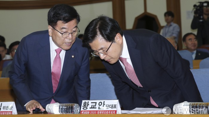 [서울=뉴스핌] 이형석 기자 = 황교안 자유한국당 대표와 김광림 2020 경제대전환위원회 위원장이 18일 오전 서울 여의도 국회 의원회관에서 열린 2020 경제대전환위원회 제1차 전체 토론회에 참석 하고 있다. 2019.06.18 leehs@newspim.com