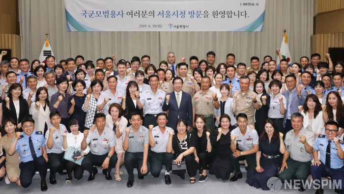 [서울=뉴스핌] 최상수 기자 = 박원순 서울시장이 18일 오후 서울 중구 서울시청에서 열린 서울시 제56회 국군모범용사 초청행사에서 모범부사관들과 기념촬영을 하고 있다. 2019.06.18 kilroy023@newspim.com