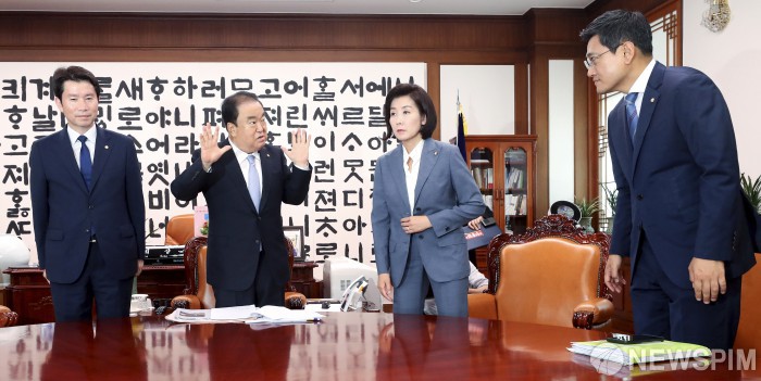 [서울=뉴스핌] 이형석 기자 = 문희상 국회의장이 24일 오후 서울 여의도 국회 의장실에서 이인영 더불어민주당, 나경원 자유한국당, 오신환 바른미래당 원내대표와 회동하고 있다. 2019.06.24 leehs@newspim.com