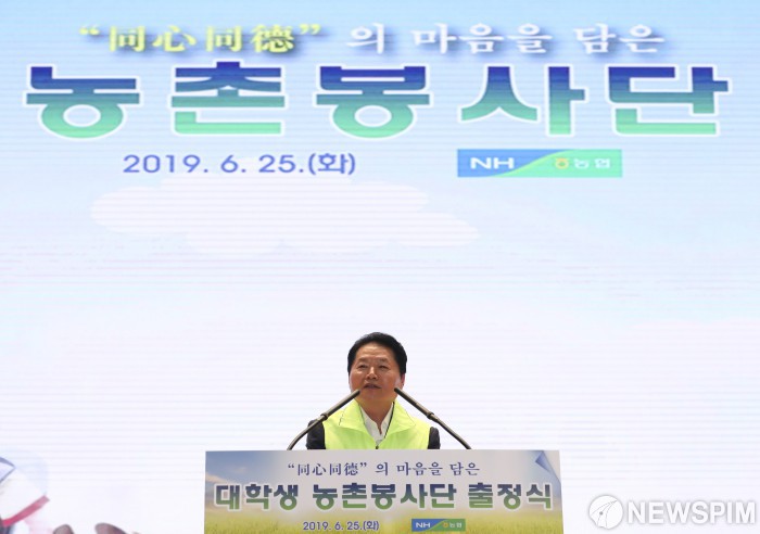 [서울=뉴스핌] 백인혁 기자 = 김병원 농업협동조합중앙회 회장이 25일 오전 서울 중구 농협중앙회 대강당에서 열린 '서울농협 대학생 농촌봉사단 출정식'에서 인사말을 하고 있다. 2019.06.25 dlsgur9757@newspim.com