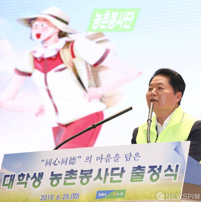 [서울=뉴스핌] 백인혁 기자 = 김병원 농업협동조합중앙회 회장이 25일 오전 서울 중구 농협중앙회 대강당에서 열린 '서울농협 대학생 농촌봉사단 출정식'에서 인사말을 하고 있다. 2019.06.25 dlsgur9757@newspim.com