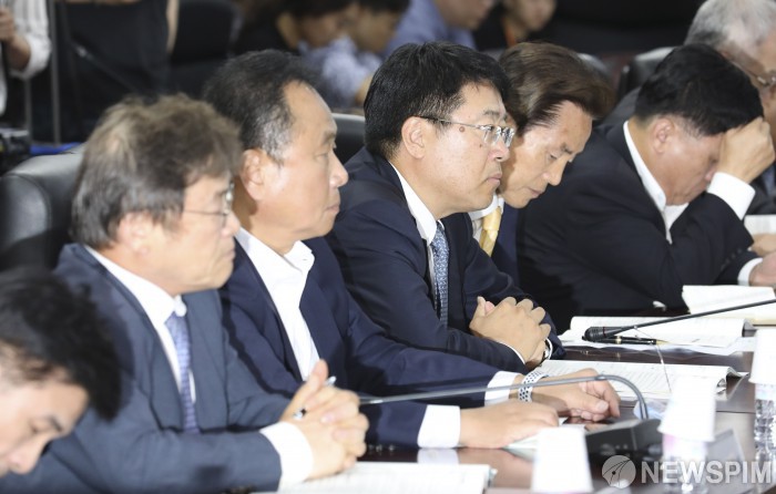 [서울=뉴스핌] 백인혁 기자 = 1일 오후 서울 종로구 한국무역보험공사 대회의실에서 열린 '수출상황점검회의'에서 수출업계 협회장들이 성윤모 산업통상자원부 장관의 모두발언에 경청하고 있다. 2019.07.01 dlsgur9757@newspim.com