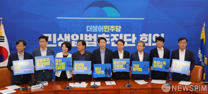 [서울=뉴스핌] 최상수 기자 = 이인영 더불어민주당 원내대표를 비롯한 참석 의원들이 5일 오전 서울 여의도 국회에서 열린 민생입법추진단 회의에서 민생입법 관련 피켓을 들고 있다. 2019.07.05 kilroy023@newspim.com