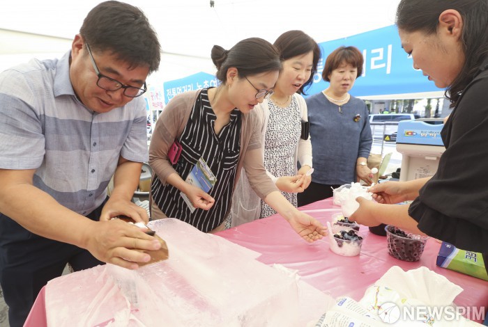 [서울=뉴스핌] 이한결 기자 = 5일 오후 서울 종로구 청계광장에서 열린 2019년 도농교류의 날·농촌여름휴가 캠페인 ‘즐거움에 푹! 공감농촌 페스티벌’에서 시민들이 대패 빙수 만들기를 체험하고 있다. 2019.07.05 alwaysame@newspim.com