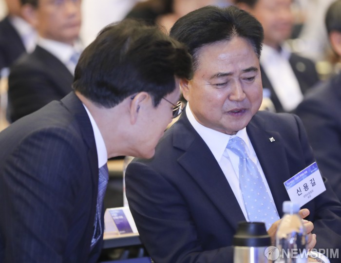 [서울=뉴스핌] 이한결 기자 = 신용길 생명보험협회 회장이 8일 오후 서울 중구 대한상공회의소(대한상의)에서 열린 ‘인슈어테크: 보험의 현재와 미래’ 세미나에서 최종구 금융위원회 위원장과 대화하고 있다. 2019.07.08 alwaysame@newspim.com