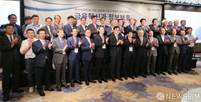 [서울=뉴스핌] 윤창빈 기자 = 최종구 금융위원회 위원장(왼쪽 여덟번째부터), 김영기 금융보안원 원장과 은행CEO 및 참석자들이 10일 오전 서울 종로구 포시즌스 호텔에서 열린 ‘제8회 정보보호의 날 기념 금융회사 최고경영자 초청 세미나’에서 기념촬영을 하고 있다. 2019.07.10 pangbin@newspim.com
