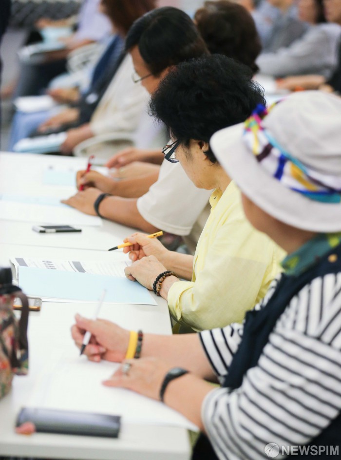 [서울=뉴스핌] 윤창빈 기자 = 11일 오후 서울 중구 서울시청에서 열린 명예시민학위제 운영을 위한 시민공청회에서 참석자들이 강연자의 강의에 집중하고 있다. 2019.07.11 pangbin@newspim.com