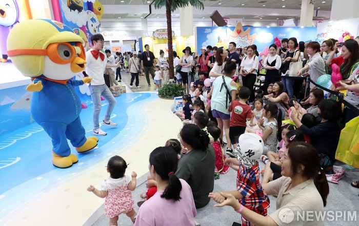 [서울=뉴스핌] 정일구 기자 = 17일 오후 서울 강남구 코엑스에서 열린 '캐릭터 라이선싱 페어 2019'에서 어린이들이 뽀로로 캐릭터를 따라 춤을 추고 있다. 2019.07.17 mironj19@newspim.com