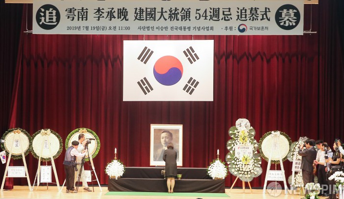 [서울=뉴스핌] 윤창빈 기자 = 19일 오전 서울 동작구 국립서울현충원 현충관에서 열린 ‘우남 이승만 건국대통령 서거 54주기 추모식’에서 참석자들이 분향을 하고 있다. 2019.07.19 pangbin@newspim.com
