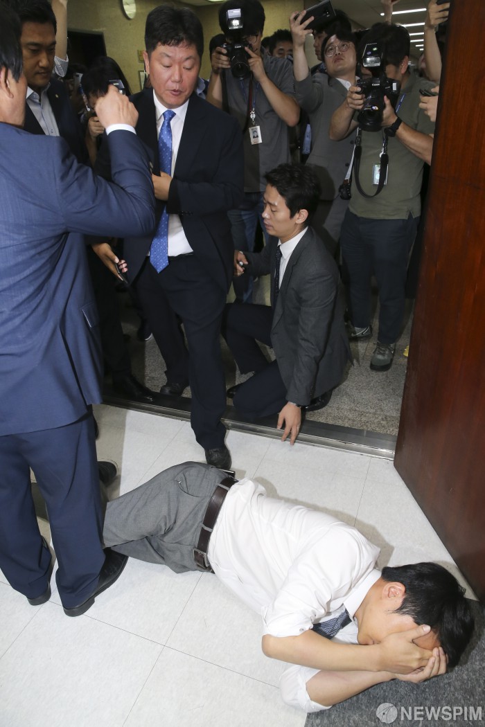 [서울=뉴스핌] 이형석 기자 = 단식 11일째를 이어가는 권성주 바른미래당 혁신위원이 22일 오전 서울 여의도 국회에서 최고위원회의를 마치고 나서는 손학규 대표를 막아서다 넘여져 있다. 2019.07.22 leehs@newspim.com