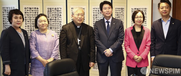 [서울=뉴스핌] 이한결 기자 = 이인영 더불어민주당 원내대표가 25일 오후 서울 중구 한국 천주교 서울대교구청에서 사회적 대타협을 위한 소통 행보의 일환으로 염수정 천주교 추기경을 예방하고 있다. 2019.07.25 alwaysame@newspim.com
