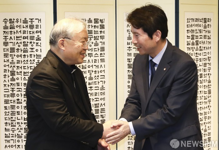 [서울=뉴스핌] 이한결 기자 = 이인영 더불어민주당 원내대표가 25일 오후 서울 중구 한국 천주교 서울대교구청에서 사회적 대타협을 위한 소통 행보의 일환으로 염수정 천주교 추기경을 예방하고 있다. 2019.07.25 alwaysame@newspim.com