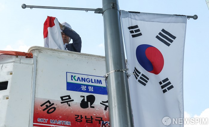 [서울=뉴스핌] 윤창빈 기자 = 2일 오후 서울 강남구 테헤란로에 걸려있던 일장기가 일본정부의 화이트리스트 한국 제외 조치에 대한 항의표시로 내려지고 있다. 이 날 일본은 국무회의를 열어 '수출우대국가(화이트리스트)'에서 한국 배제를 확정하는 수출무역관리령 개정을 의결 했다. 2019.08.02 pangbin@newspim.com