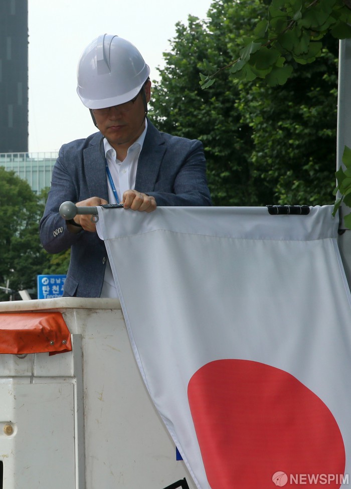 [서울=뉴스핌] 윤창빈 기자 = 2일 오후 서울 강남구 테헤란로에 걸려있던 일장기가 일본정부의 화이트리스트 한국 제외 조치에 대한 항의표시로 내려지고 있다. 이 날 일본은 국무회의를 열어 '수출우대국가(화이트리스트)'에서 한국 배제를 확정하는 수출무역관리령 개정을 의결 했다. 2019.08.02 pangbin@newspim.com