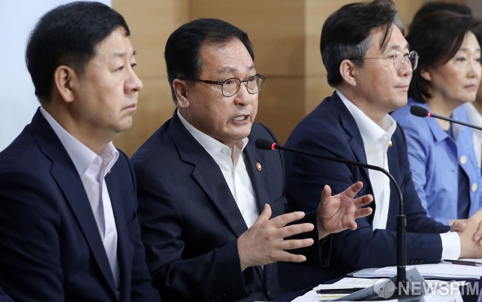 [서울=뉴스핌] 정일구 기자 = 유영민 과학기술정보통신부 장관(왼쪽 두번째)이 5일 오전 서울 종로구 정부서울청사에서 대외의존형 산업구조 탈피를 위한 '소재·부품·장비 경쟁력 강화대책' 발표 관련 질의응답을을 하고 있다. 2019.08.05 mironj19@newspim.com