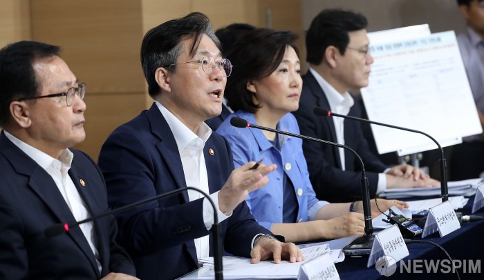 [서울=뉴스핌] 정일구 기자 = 성윤모 산업통상자원부 장관이 5일 오전 서울 종로구 정부서울청사에서 대외의존형 산업구조 탈피를 위한 '소재·부품·장비 경쟁력 강화대책' 발표를 하고 있다. 왼쪽부터 유영민 과학기술정보통신부 장관, 성 장관, 박영선 중소벤처기업부 장관, 윤종인 행정안전부 차관, 최종구 금융위원장. 2019.08.05 mironj19@newspim.com