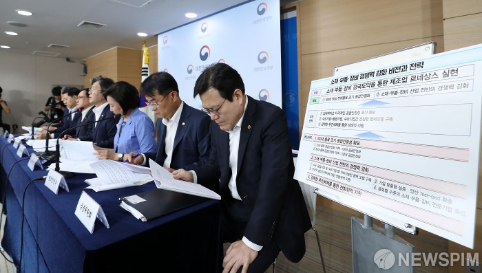 [서울=뉴스핌] 정일구 기자 = 성윤모 산업통상자원부 장관이 5일 오전 서울 종로구 정부서울청사에서 대외의존형 산업구조 탈피를 위한 '소재·부품·장비 경쟁력 강화대책' 발표를 하고 있다. 왼쪽부터 박천규 환경부 차관, 구윤철 기획재정부 제2차관, 유영민 과학기술정보통신부 장관, 성 장관, 박영선 중소벤처기업부 장관, 윤종인 행정안전부 차관, 최종구 금융위원장. 2019.08.05 mironj19@newspim.com