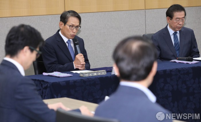 [서울=뉴스핌] 백인혁 기자 = 조민제 한국전시주최자협회 회장이 12일 오전 서울 중구 서울시청에서 열린 '서울시-(사)한국전시주최자협회 제로페이 활성화 업무협약식'에서 인사말을 하고 있다. 2019.08.12 dlsgur9757@newspim.com