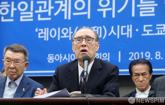 [서울=뉴스핌] 정일구 기자 = 12일 오전 서울 중구 한국프레스센터에서 동아시아평화회의 주관으로 열린 '한·일관계의 위기를 넘어 동아시아의 평화로!' 8.15 74주년 특별성명 발표 기자회견에서 좌장을 맡은 이홍구 전 국무총리가 발언을 하고 있다. 2019.08.12 mironj19@newspim.com
