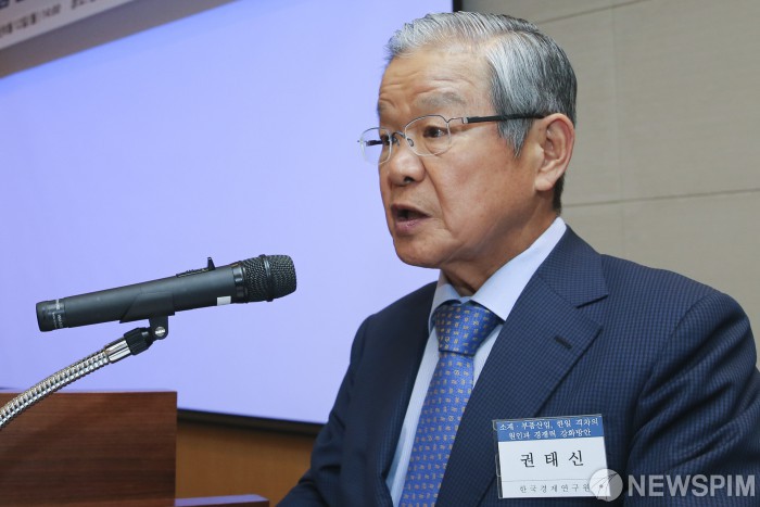 [서울=뉴스핌] 이형석 기자 = 권태신 한국경제연구원장이 15일 오후 서울 여의도 전경련회관에서 열린 ‘소재‧부품 산업, 한일 격차의 원인과 경쟁력 강화방안’ 세미나에서 개회사를 하고 있다. 2019.08.12 leehs@newspim.com