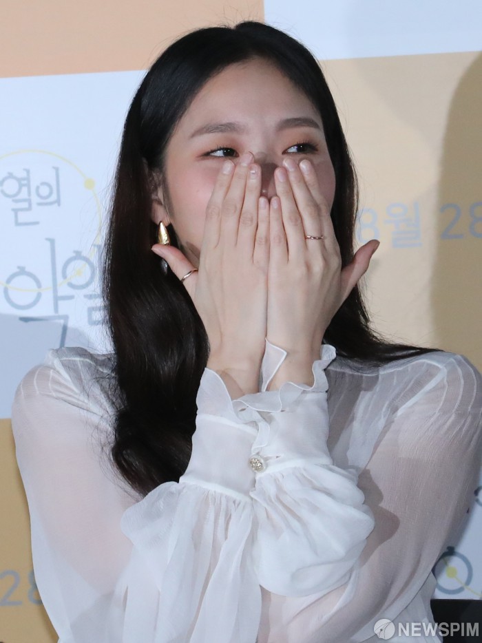 [서울=뉴스핌] 백인혁 기자 = 배우 김고은이 20일 오후 서울 용산구 용산 CGV 아이파크몰에서 열린 영화 '유열의 음악앨범' 언론시사회에서 정지우 감독의 질의응답 도중 깜짝 놀라 손으로 얼굴을 가리고 있다. 2019.08.20 dlsgur9757@newspim.com