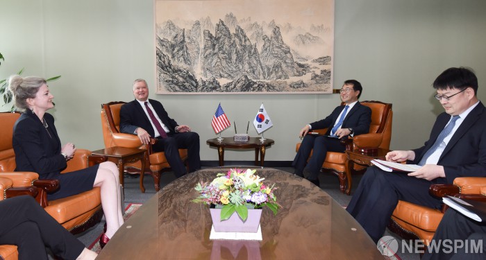 아시아투데이 정재훈 기자 = 이도훈 외교부 한반도평화교섭본부장(오른쪽)과 스티브 비건 미 국무부 대북정책특별대표가 21일 오전 서울 종로구 외교부 청사에서 한미 북핵 수석대표 협의를 위해 만나 환담을 나누고 있다.