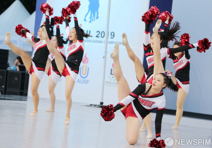 [서울=뉴스핌] 윤창빈 기자 = 24일 오후 서울 중구 서울 시청광장에서 열린 서울국제치어리딩스포츠대회에서 고등학생 치어리더팀이 화려한 치어리딩을 보여주고 있다. 서울시와 아시아대학스포츠연맹(AUSF)이 공동 주최하는 서울국제치어리딩스포츠대회는 중국, 대만 등 11개국 700여 명의 선수가 참가하는 아시아 최대 대학스포츠치어리딩대회다. 2019.08.24 pangbin@newspim.com