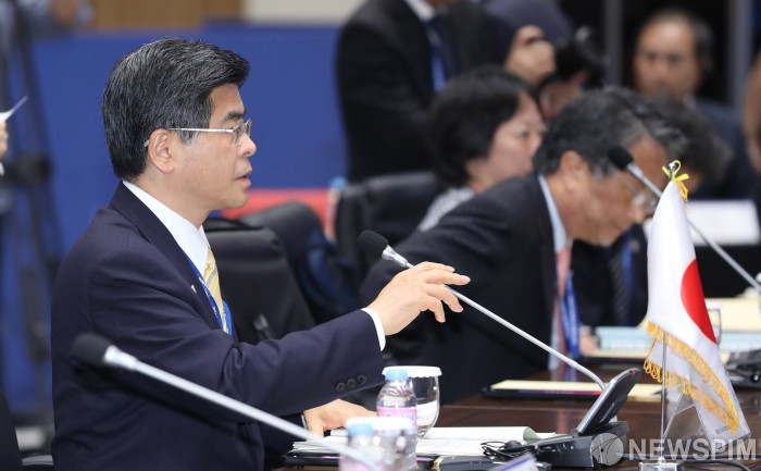 [송도=뉴스핌] 백인혁 기자 = 이시이 게이치 일본 국토교통상이 30일 오후 인천 연수구 송도 컨벤시아에서 열린 한일 관광장관 회의에 참석해 마이크를 고쳐 잡고 있다. 2019.08.30 dlsgur9757@newspim.com
