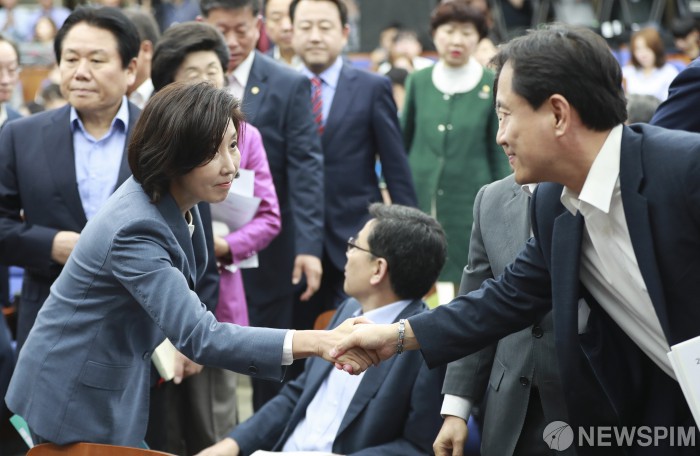 [서울=뉴스핌] 이형석 기자 = 나경원 자유한국당 원내대표가 3일 오후 서울 여의도 국회에서 열린 ‘조국 후보자의 거짓! 실체를 밝힌다 언론 간담회’에 참석 하며 김진태 의원과 악수를 하고 있다. 2019.09.03 leehs@newspim.com
