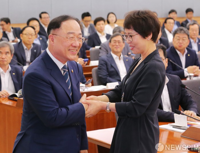 [서울=뉴스핌] 윤창빈 기자 = 홍남기 경제부총리 겸 기획재정부 장관이 4일 오전 서울 종로구 정부서울청사 별관에서 열린 공공기관장 워크숍에서 참석자와 인사를 나누고 있다. 2019.09.04 pangbin@newspim.com