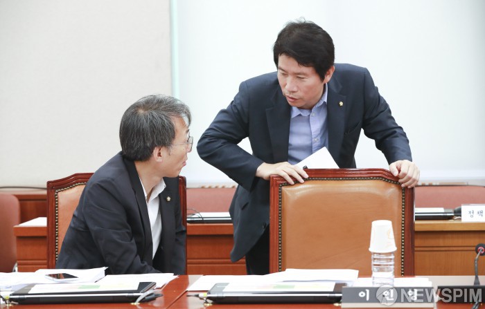 [서울=뉴스핌] 이형석 기자 = 이인영 더불어민주당 원내대표와 이훈 의원이 5일 오전 서울 여의도 국회에서 열린 산업통상자원중소벤처기업위원회 제2차 전체회의에서 대화를 나누고 있다. 2019.09.05 leehs@newspim.com