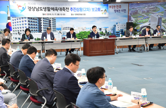 | 제30회 경남도생활체육대축전 성공개최를 위한 추진기획단의 2차 보고회가 열리고 있다.[사진=진주시청]2019.9.17 |